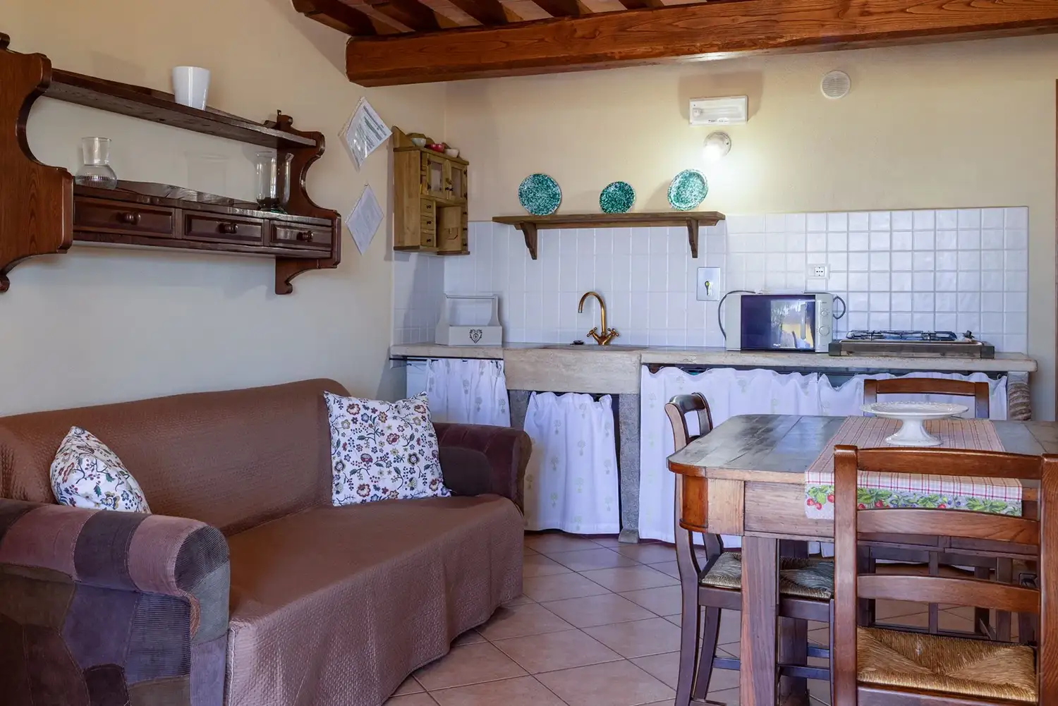 Woon-/eetkamer met tweepers. slaapbank en keuken. Slaapkamer met tweepers. bed.