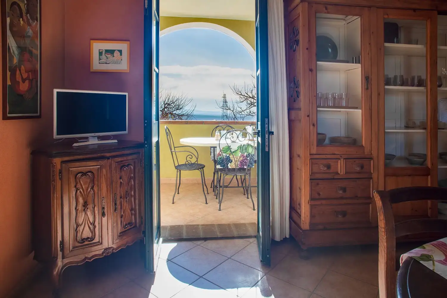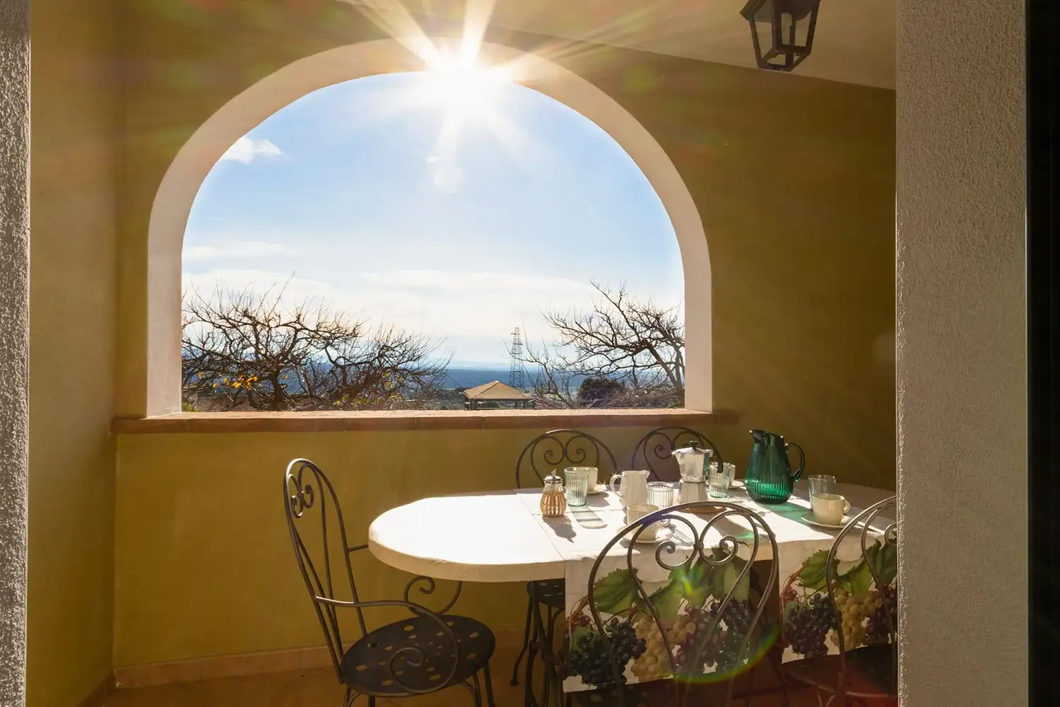 Overdekt terras voorzien van tafel en stoelen.