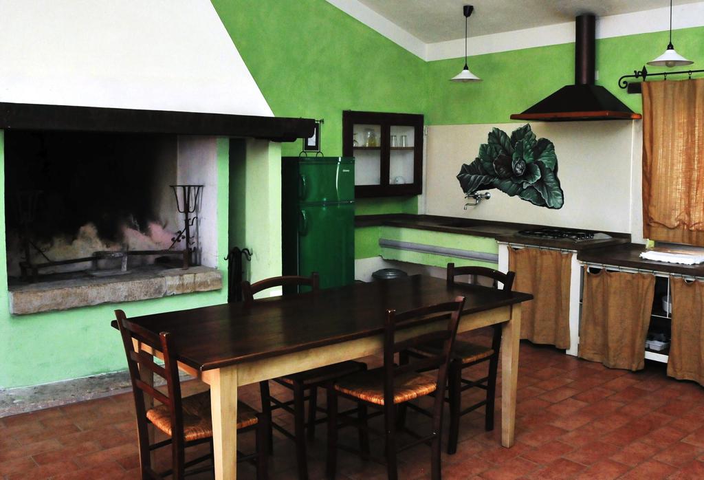 Woonkamer met open haard, slaapbank en keuken.