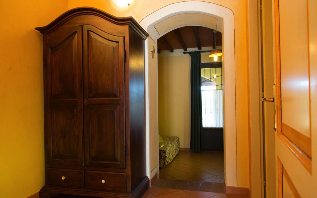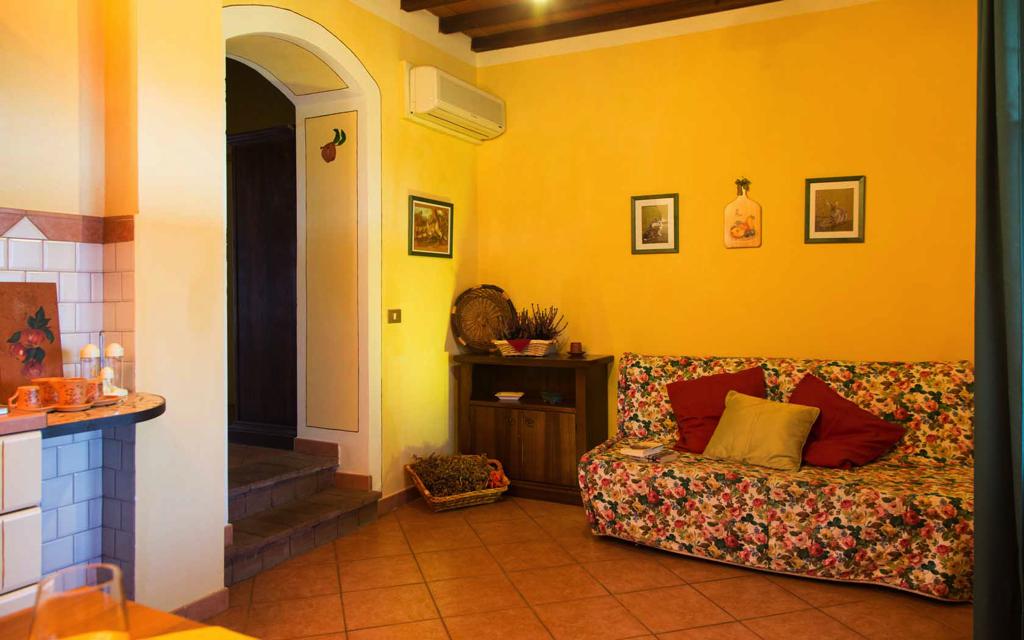 Woonkamer met keuken en tweepers. slaapbank. Slaapkamer met tweepers. bed en eenpers. bed. Badkamer.